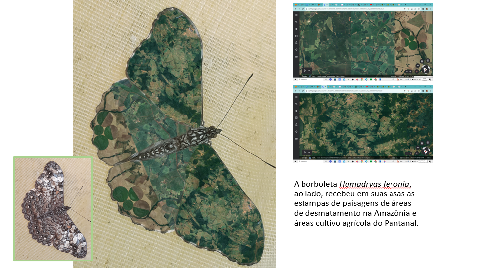 “Asas da paisagem” traz nove fotografias de borboletas e mariposas tropicais registradas na região da Serra do Japi e sobre as quais Guadagnini criou intervenções nas estampas das asas, substituindo-as por imagens de satélite de locais no Brasil que sofreram os efeitos das mudanças climáticas extremas ou tiveram profundas alterações na paisagem causadas pela ação humana.