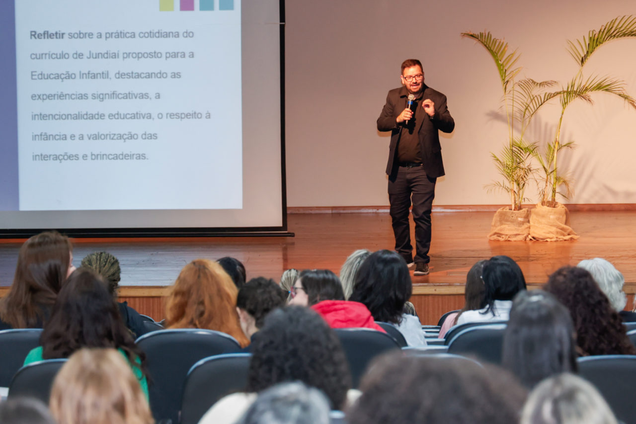 Durante a palestra, com tema “Currículo Jundiaiense na Educação Infantil: Qualificando a Prática”, Douglas ressaltou a importância da centralidade da criança no Currículo, do papel do segmento no desenvolvimento de habilidades, competências e formação de repertório dos estudantes.