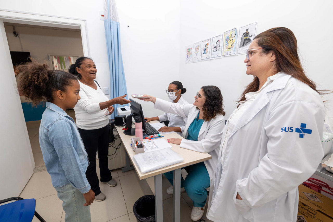 Alana, 9, e a vó, Lúcia Maria, tiveram as carteiras verificadas pela equipe de saúde
