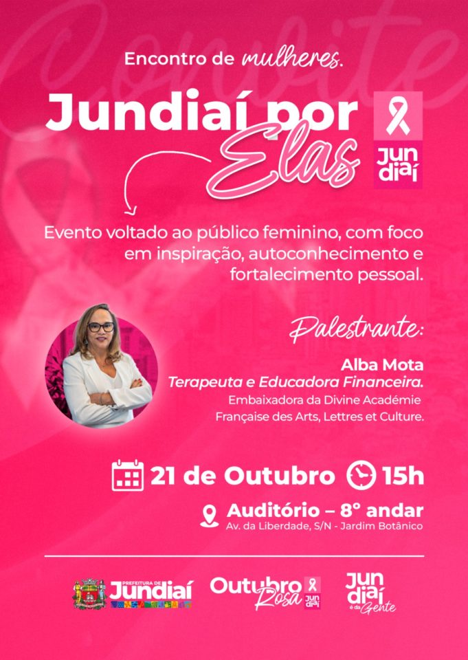 Publicada em 18/10/2025 às 14:00A Prefeitura de Jundiaí, através do Núcleo de Articulação em Direitos Humanos, por meio da Assessoria de Políticas para Mulheres, promove na próxima terça-feira (21) o encontro “Jundiaí por Elas”, uma tarde voltada à inspiração, ao fortalecimento e à celebração do protagonismo feminino. O evento conta com o apoio do Conselho Municipal dos Direitos da Mulher (CMDM) e integra as ações da campanha Outubro Rosa no município.