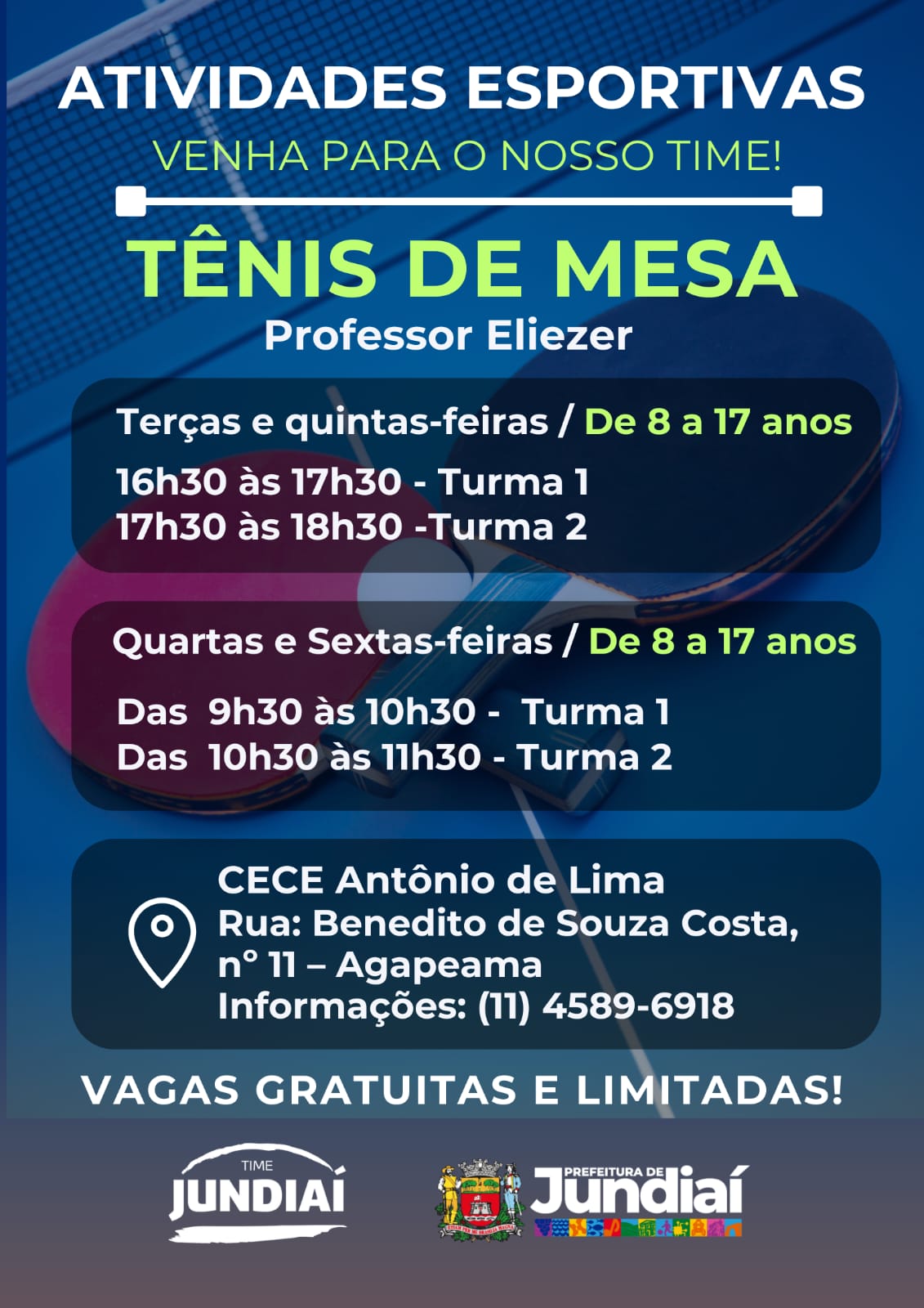 Publicada em 04/11/2025 às 09:00A Prefeitura de Jundiaí, através da Secretaria Municipal de Esporte e Lazer (SMEL), abriu vagas para crianças e adolescentes (de 8 a 17 anos) iniciantes fazerem aulas de tênis de mesa gratuitamente, duas vezes por semana. Os interessados em integrar o Time Jundiaí da modalidade podem se matricular no local das atividades – o CECE Antônio de Lima, no bairro Agapeama (Rua Benedito de Souza Costa, 11). Outras informações podem ser obtidas pelo telefone (11) 4589-6918.