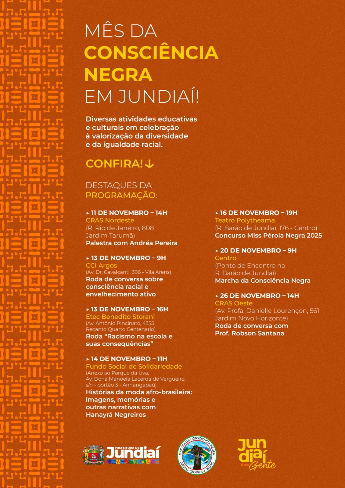 As atividades incluem palestras, rodas de conversa e homenagens que acontecerão em diversos espaços da cidade, como CRAS Nordeste e Oeste, CCI Argos, CIEMPI e Etec Benedito Storani. Entre os temas abordados estão consciência racial e envelhecimento ativo, racismo na escola, maternidade negra e identidade e representatividade da população negra. No dia 20 de novembro, data em que se celebra o Dia da Consciência Negra, haverá também a tradicional Marcha da Consciência Negra, realizada pela sociedade civil, em caminhada pela Rua Barão de Jundiaí.
