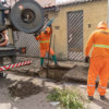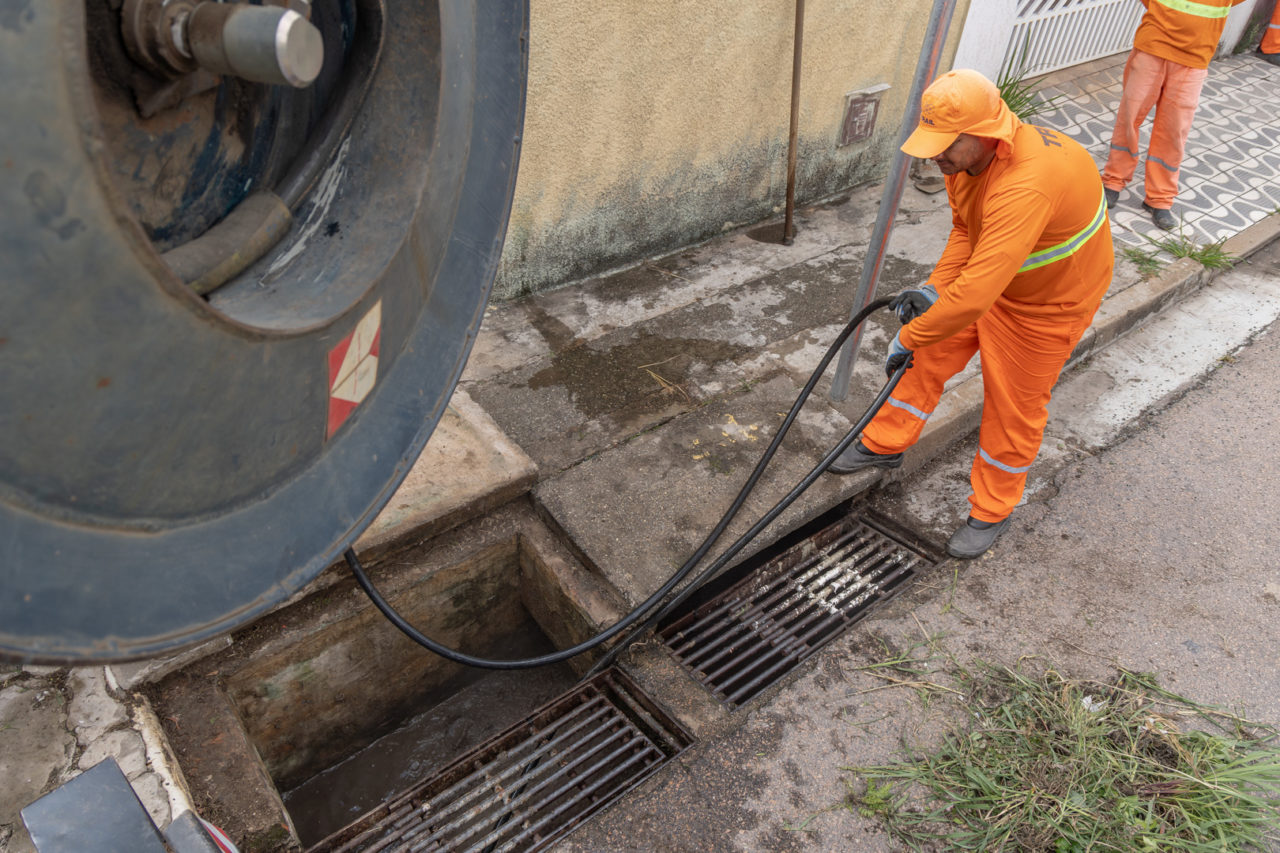 Os trabalhos incluem a retirada de resíduos das bocas de lobo e, em seguida, o uso do hidrojato para desobstrução completa das galerias pluviais, permitindo melhor escoamento da água.