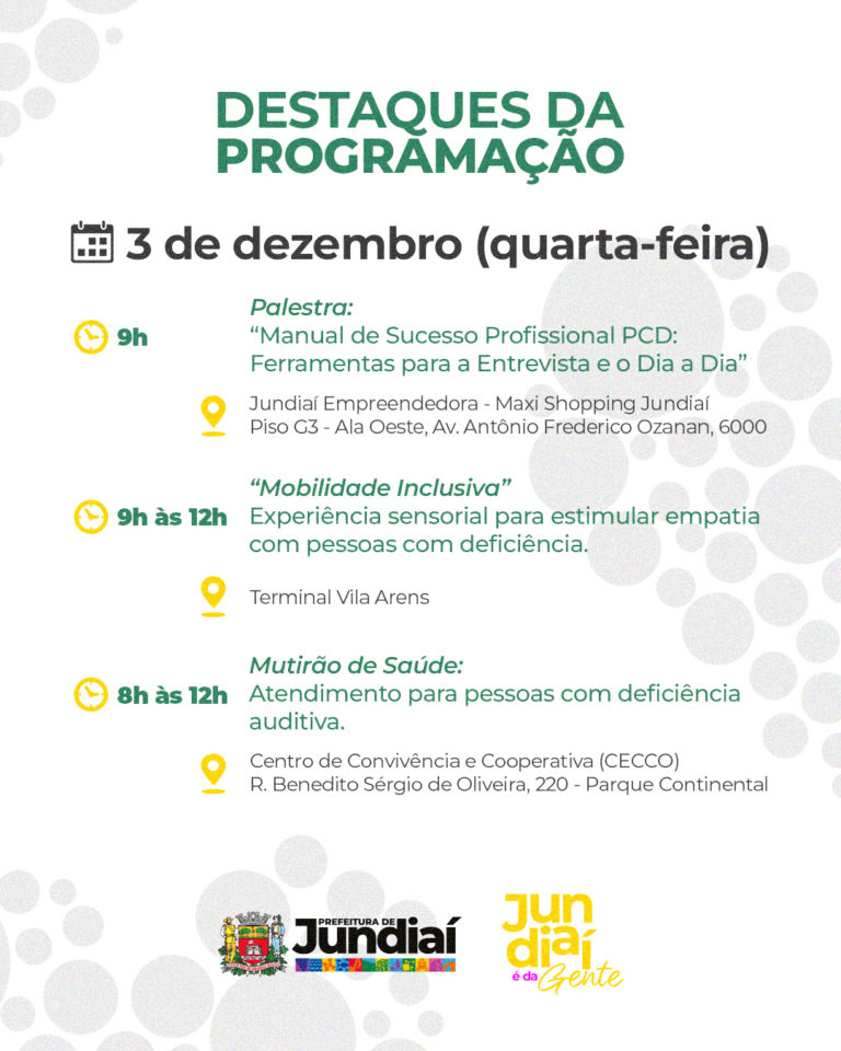 • 1º de dezembro – Cerimônia de abertura e palestra “Deficiência e Cidadania: Como Nosso Atendimento Transforma Vidas” no Paço Municipal.