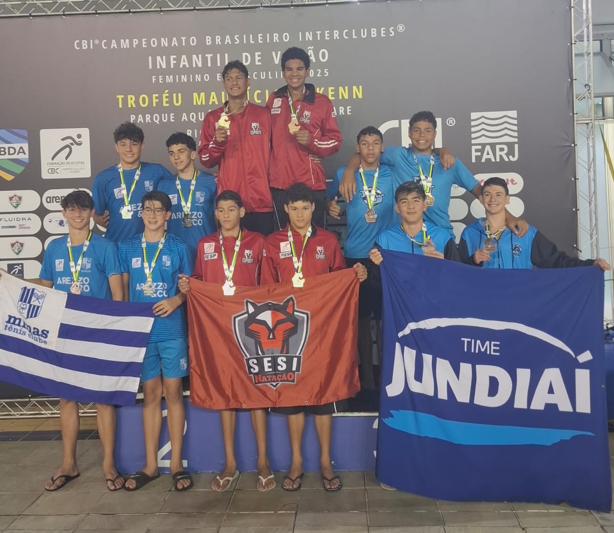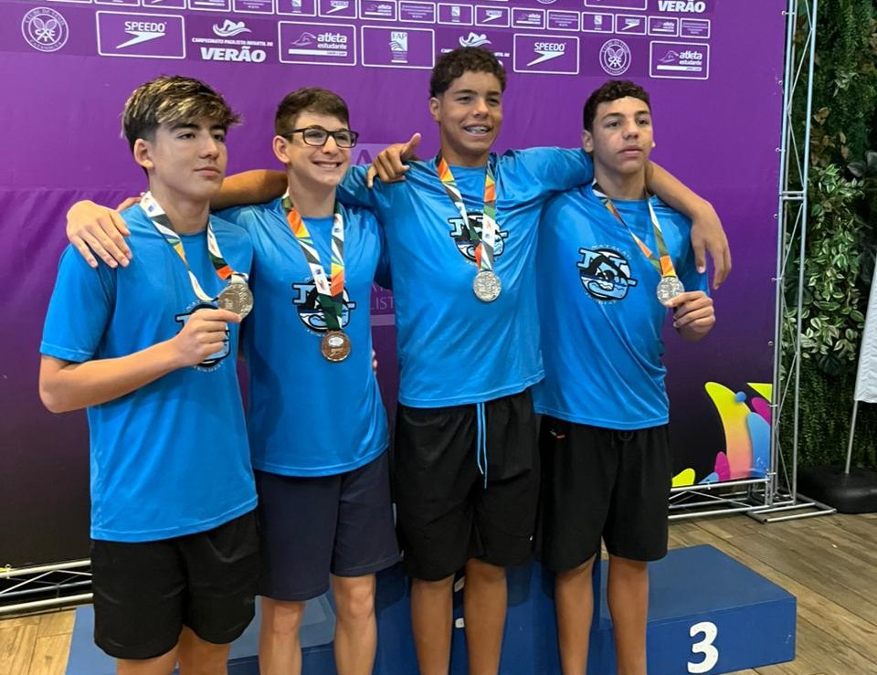 Publicada em 01/12/2025 às 15:00O Time Jundiaí de Natação alcançou um feito inédito ao conquistar a medalha de bronze no revezamento 4x100m livre masculino do Campeonato Brasileiro Infantil, realizado no Rio de Janeiro. Essa foi a primeira vez que uma equipe representando o município subiu ao pódio em provas de revezamento nesta competição nacional.