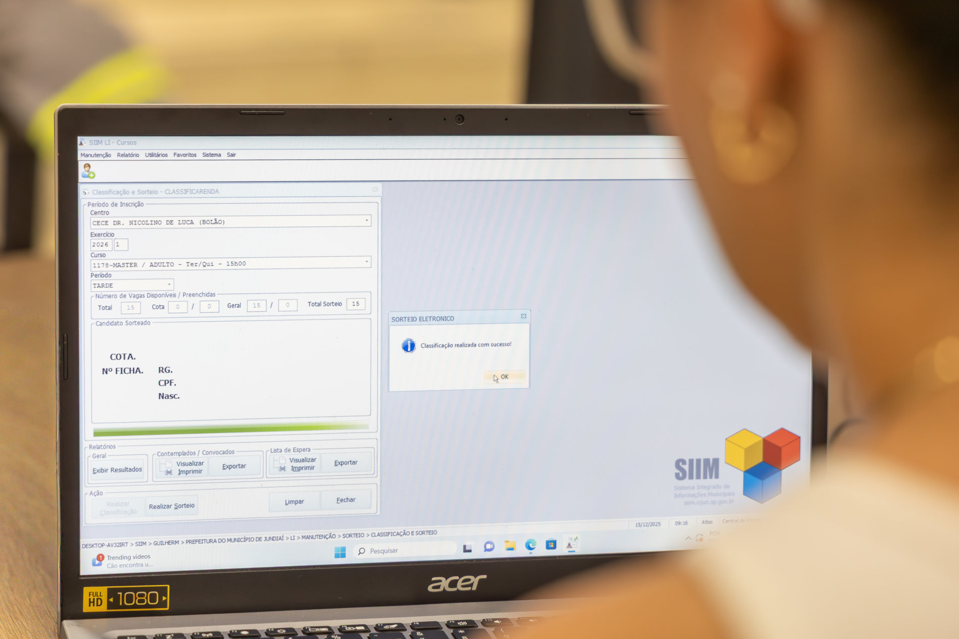 Publicada em 17/12/2025 às 18:15A Prefeitura de Jundiaí, através da Secretaria Municipal de Esporte e Lazer (SMEL), realizou na última segunda-feira (15) o sorteio dos inscritos nas aulas gratuitas de natação em 2026, a serem ministradas na piscina do Complexo Aquático Devanir Wanderlei Penteado Jr, dentro do CECE Nicolino de Luca (Bolão), no Anhangabaú. O processo foi todo digital e transparente, contou com a colaboração da equipe da Companhia de Informática de Jundiaí (CIJUN) e pôde ser acompanhado presencialmente, no auditório do oitavo andar do Paço Municipal.