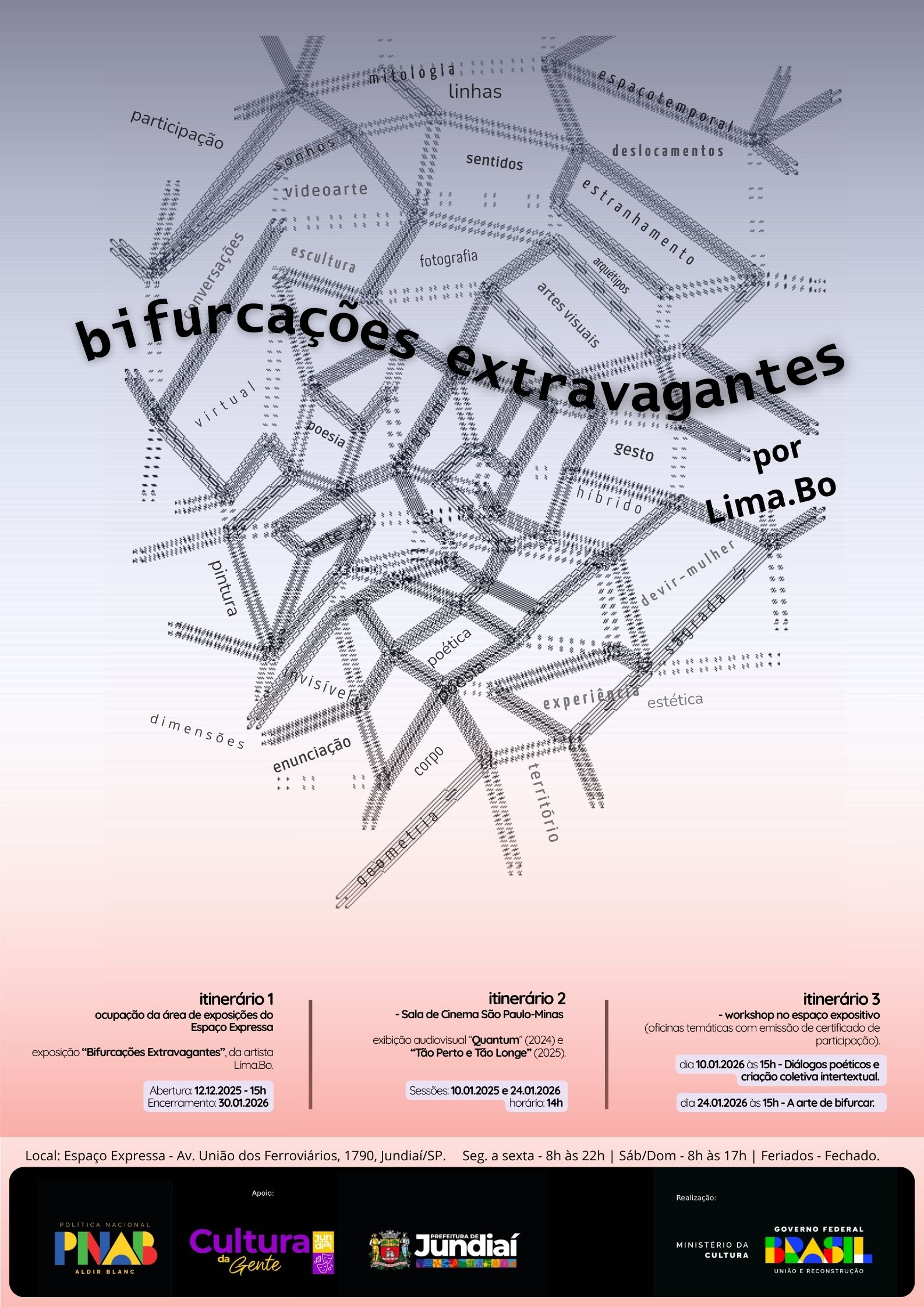 Publicada em 09/01/2026 às 09:00O Espaço Expressa de Jundiaí será palco, de sexta a domingo (9, 10 e 11 de janeiro), da Exposição “Bifurcações Extravagantes”, da artista Lima Bo. O evento conta com apoio da Prefeitura de Jundiaí, através da Secretaria Municipal de Cultura (SMCULT), tem entrada gratuita ao público e reúne um conjunto de 10 obras, entre esculturas, pinturas, colagens digitais e vídeos, concebidas a partir de investigações sobre memória, tempo e matéria. A mostra propõe um percurso sensorial e poético em que corpo, território e palavra se entrelaçam, convidando o público a experimentar o espaço como quem atravessa uma paisagem em movimento.