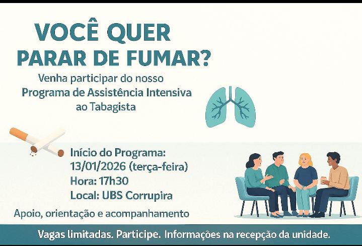 Publicada em 12/01/2026 às 17:14A Unidade Básica de Saúde (UBS) Corrupira dá início nesta terça-feira (13) a um grupo do Programa de Assistência Intensiva ao Tabagista (PAIT). A participação é gratuita e aberta a qualquer munícipe que deseje parar de fumar, contando com apoio, orientação e acompanhamento por meio de encontros presenciais na unidade.