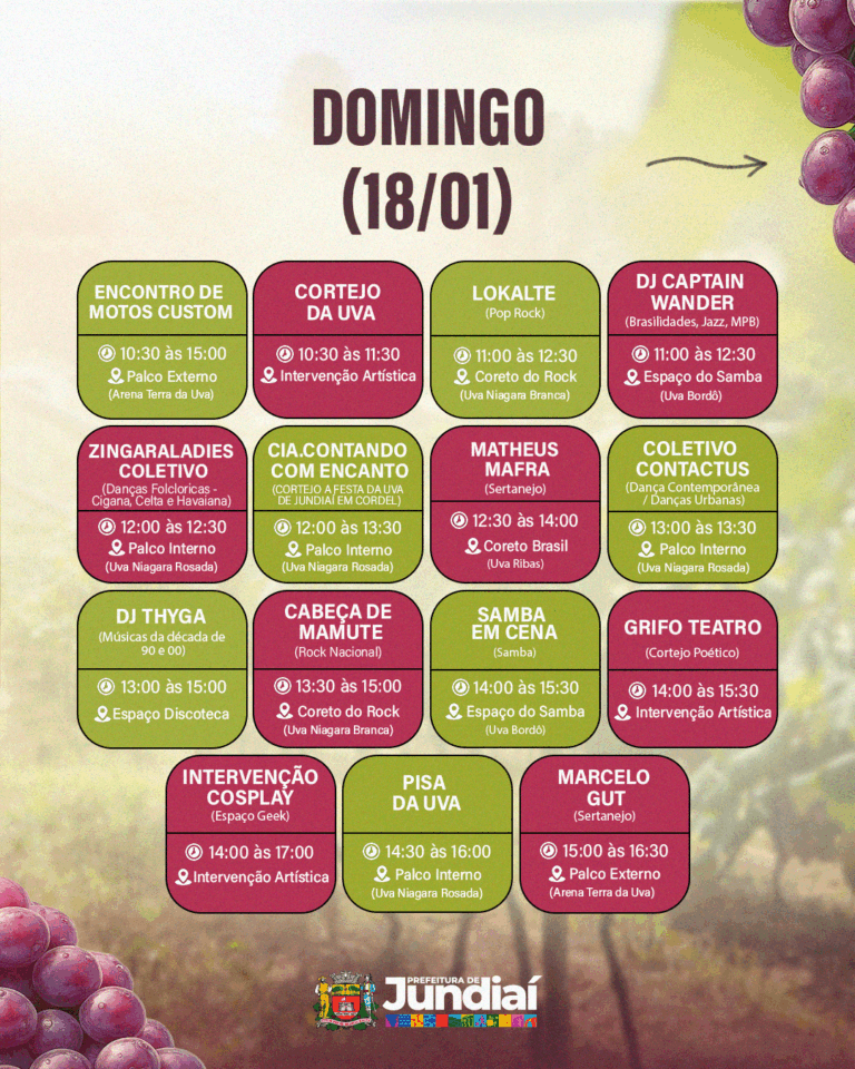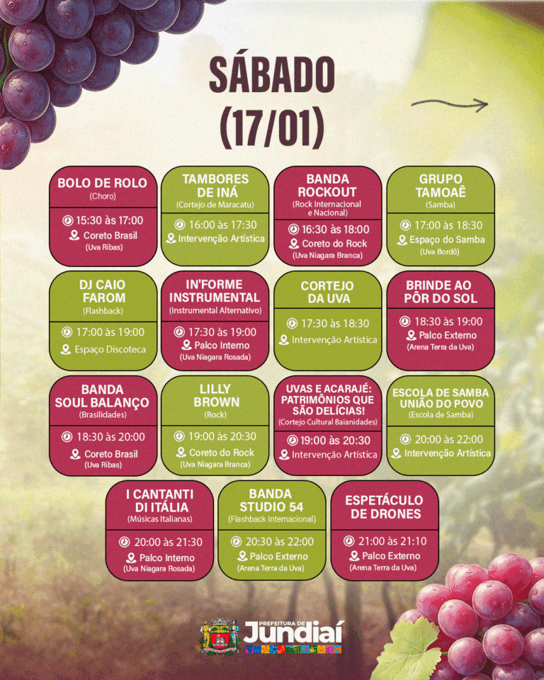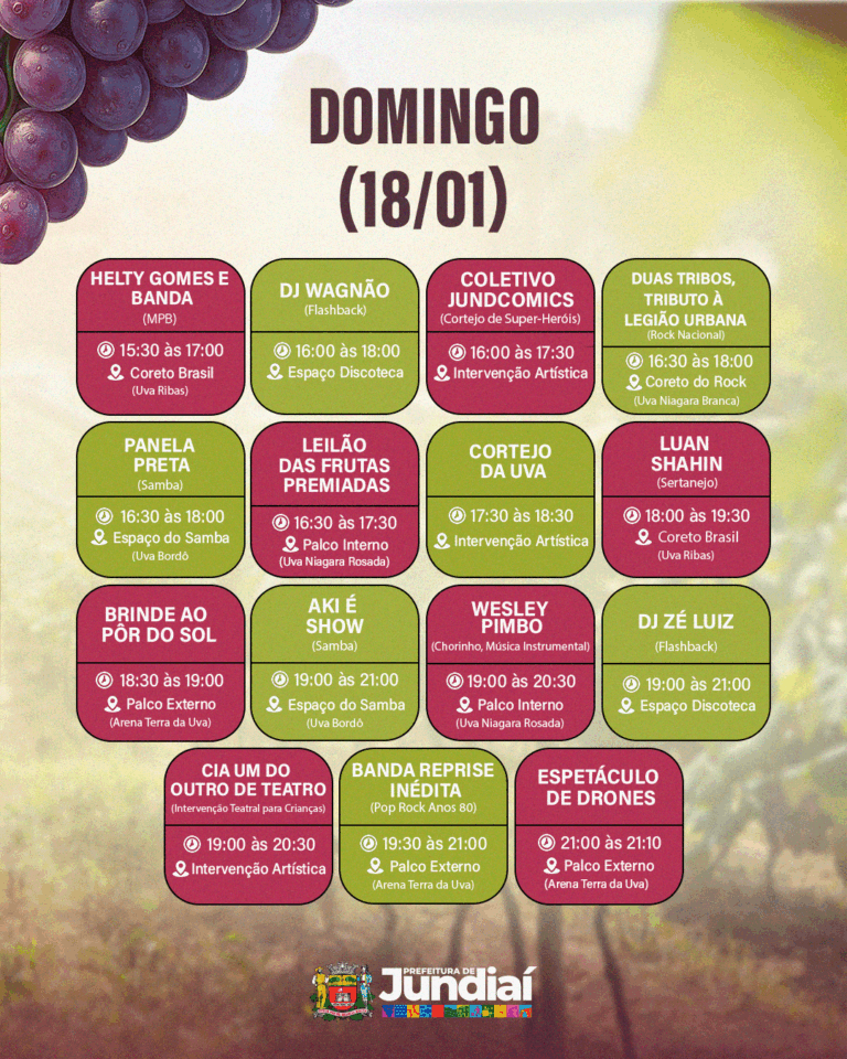 A edição de 2026 acontece ao longo de quatro finais de semana no Parque Comendador Antônio Carbonari (Parque da Uva), nos dias 17 e 18; 23, 24 e 25; 30 e 31 de janeiro; e 1º, 6, 7 e 8 de fevereiro.