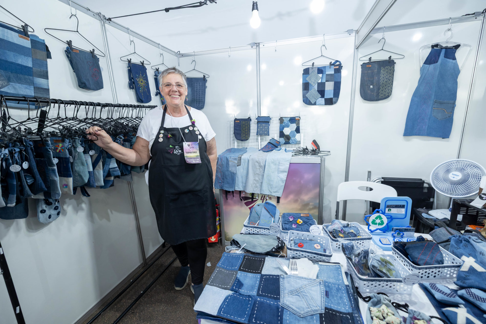 Vera Cosin encontrou na sustentabilidade uma forma de empreender, reutilizando jeans que seriam descartados no lixo para confeccionar produtos como bolsas, doleiras e jogos americanos. “O jeans é um grande poluidor ambiental, e aqui conseguimos fazer, deles, peças úteis para o dia a dia. A Festa da Uva é a nossa propaganda, porque recebemos todo tipo de público.”