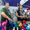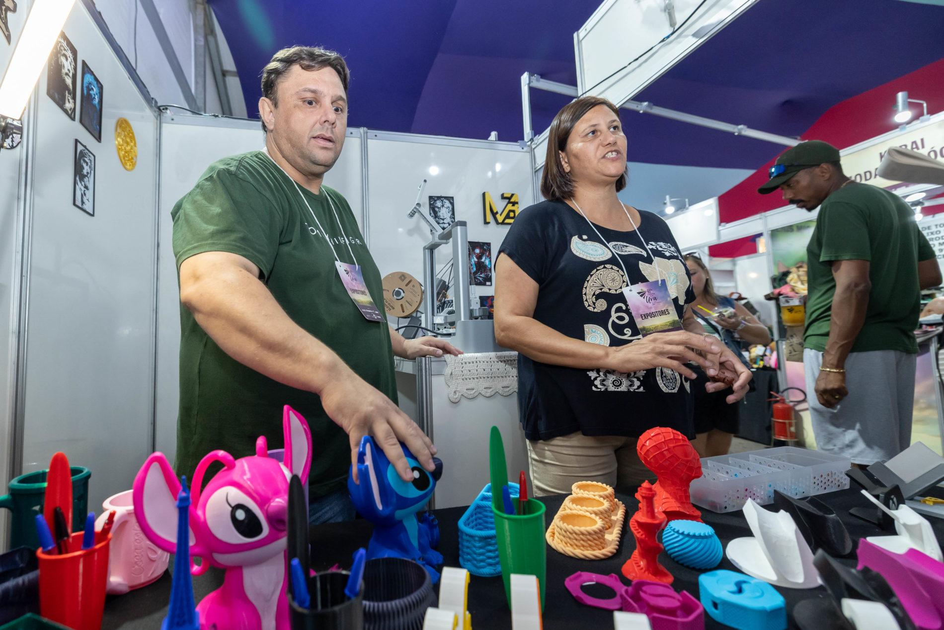 Unindo tecnologia e arte, o casal Cristina Soares e Marcos Roberto Moreira é dono das mãos por trás das peças coloridas feitas com impressora 3D. Com produtos a partir de apenas R$ 6, o estande atrai olhares curiosos especialmente das crianças e jovens. “Eles adoram os bichos e personagens de desenho, que também fazemos por encomenda no tamanho e formato desejado. O sucesso é tanto que em um único dia quase vendemos todo o estoque.”