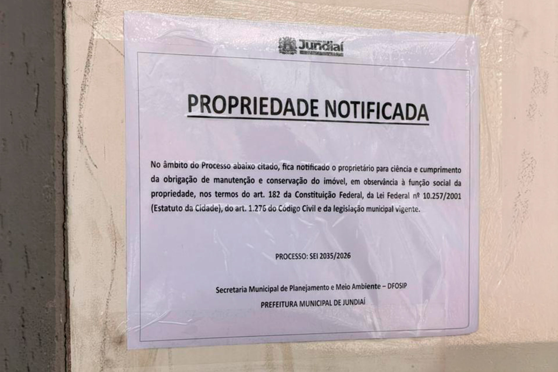 A medida está amparada pela Lei Federal nº 10.257/2001 (Estatuto da Cidade), do artigo 1.276 do Código Civil e da legislação municipal em vigor, que tratam da função social da propriedade e da responsabilidade do proprietário quanto à manutenção do imóvel.
