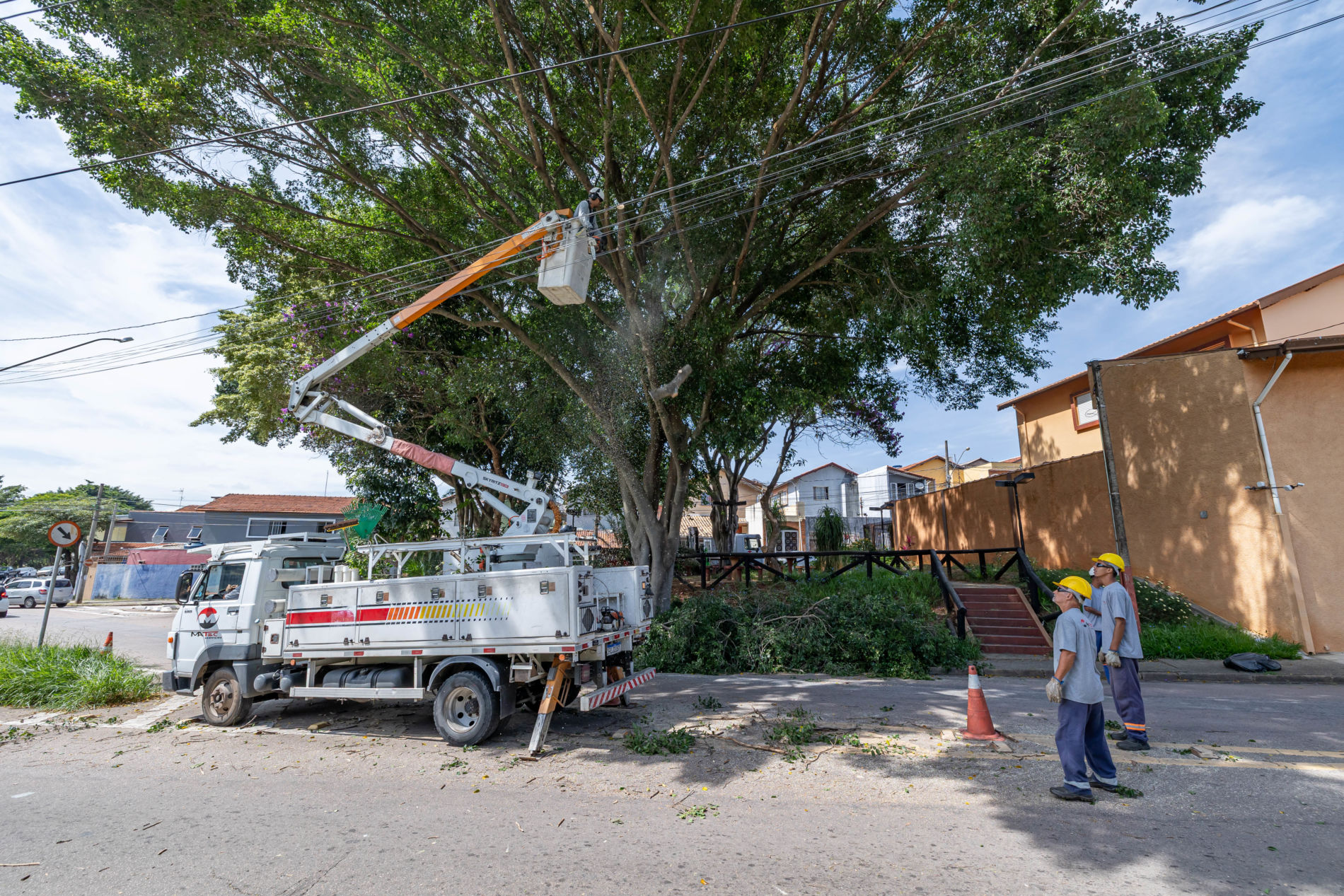 Um dos pontos atendidos na última semana foi uma praça da Rua Irineu Dolce, no bairro Eloy Chaves, na região Oeste. Os galhos avançavam sobre a rede elétrica e representavam risco aos moradores, principalmente diante das chuvas registradas nos últimos dias.