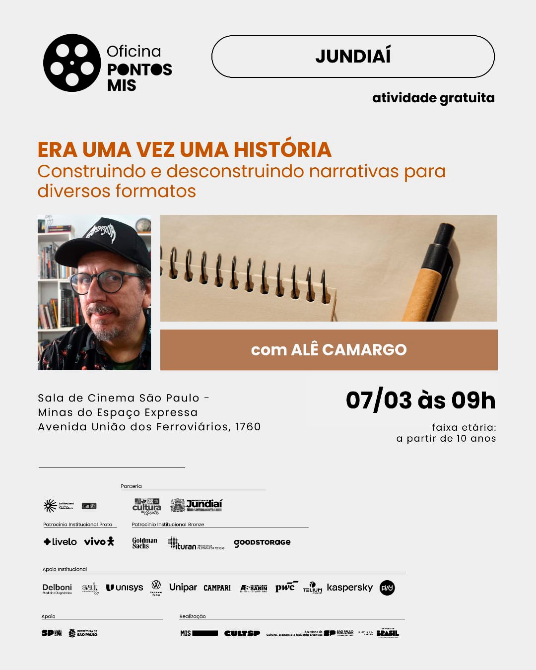 Publicada em 04/03/2026 às 17:12A oficina “Era Uma Vez Uma História”, do programa Pontos MIS, será realizada no dia 7 de março, das 9h às 13h, no Espaço Expressa, em Jundiaí, com a proposta de incentivar a criação de narrativas de forma acessível e estruturada. O encontro apresentará ferramentas práticas para que os participantes desenvolvam suas próprias histórias e será conduzido pelo premiado diretor e roteirista de animação Alê Camargo, responsável por curtas como “Os Anjos do Meio da Praça”, “A Ilha” e “A Noite do Vampiro”.