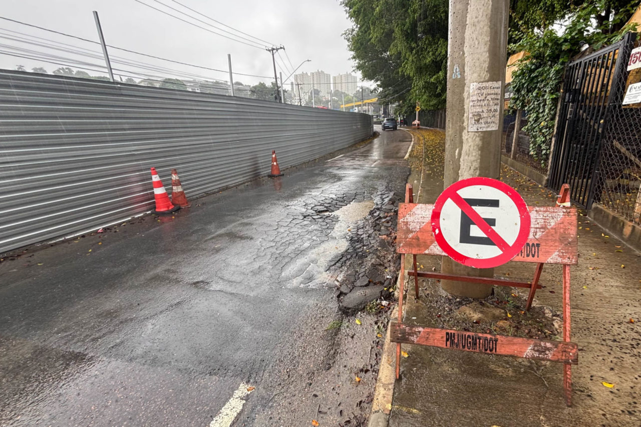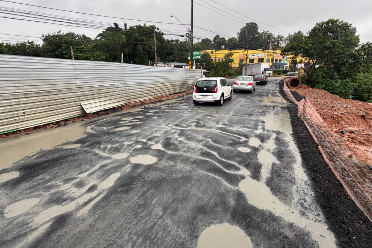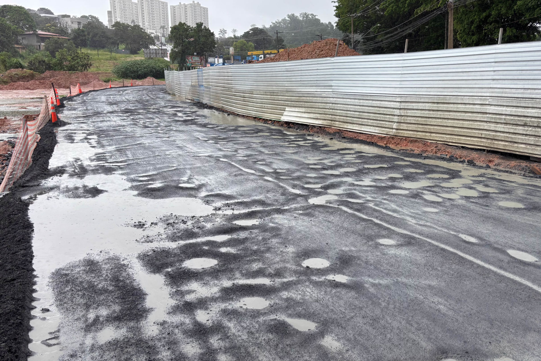 Entre as intervenções obrigatórias previstas para o projeto está a implantação do sistema de drenagem da região, obra que é de responsabilidade da empresa. Para a execução dos serviços, foi necessário realizar um desvio de trânsito temporário, o que acabou comprometendo o pavimento de uma das vias utilizadas como rota alternativa.