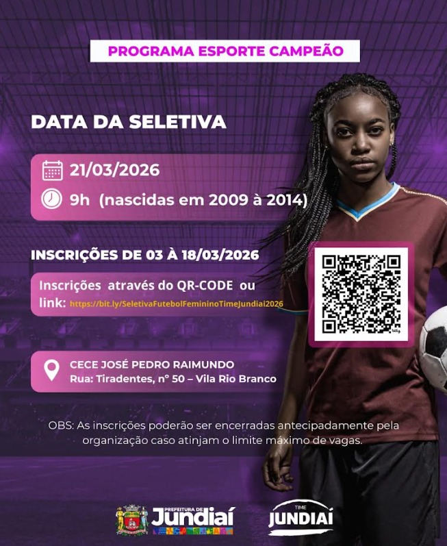 Publicada em 14/03/2026 às 09:00Meninas de 12 a 17 anos que sonham em jogar futebol têm uma nova oportunidade em Jundiaí. No dia 21 de março, às 9h, será realizada uma seletiva de futebol feminino para formação do Time Jundiaí. A avaliação, destinada a atletas nascidas entre 2009 e 2014, acontece no campo do CECE José Pedro Raymundo, na Vila Rio Branco, com organização da Secretaria Municipal de Esporte e Lazer (SMEL).