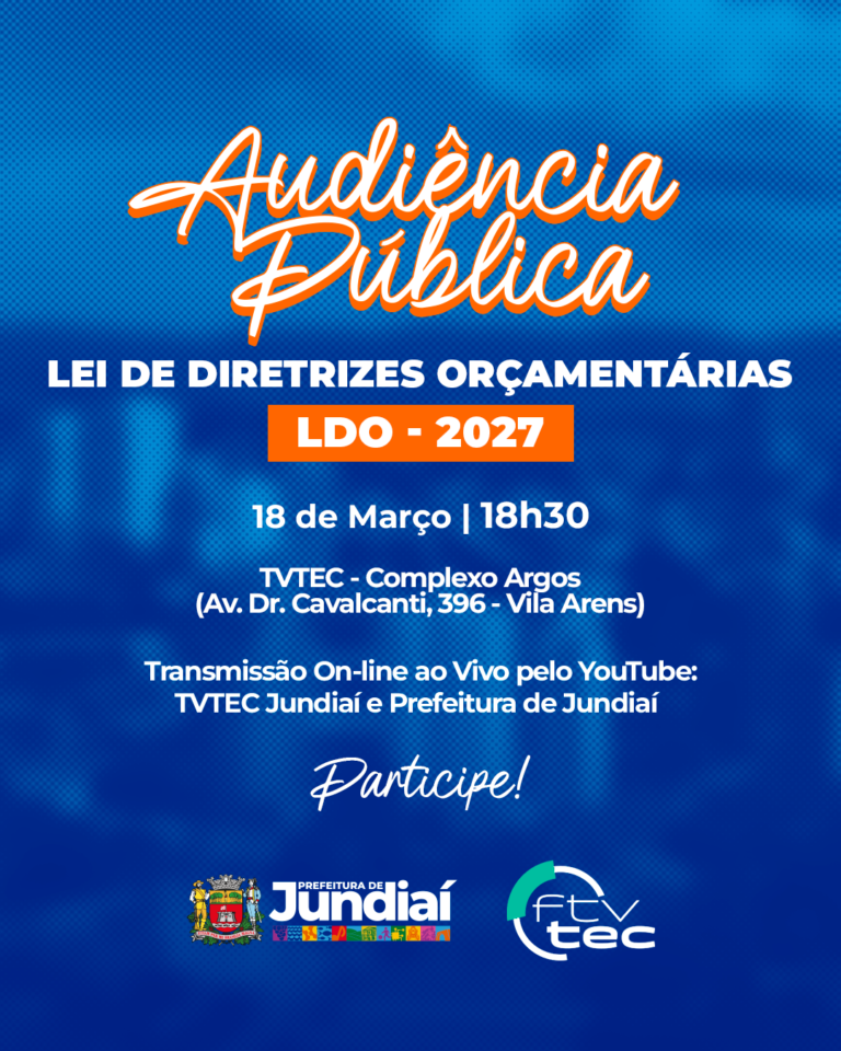 Publicada em 16/03/2026 às 17:45A Prefeitura de Jundiaí realizará uma audiência pública para discutir a elaboração da Lei de Diretrizes Orçamentárias (LDO) de 2027. O encontro será realizado no dia 18 de março de 2026, às 18h30, no estúdio da TVTEC, localizado na Avenida Dr. Cavalcanti, 396 – Complexo Argos, e será aberto à participação da população, que pode acompanhar tanto presencial, como também pelo Youtube!