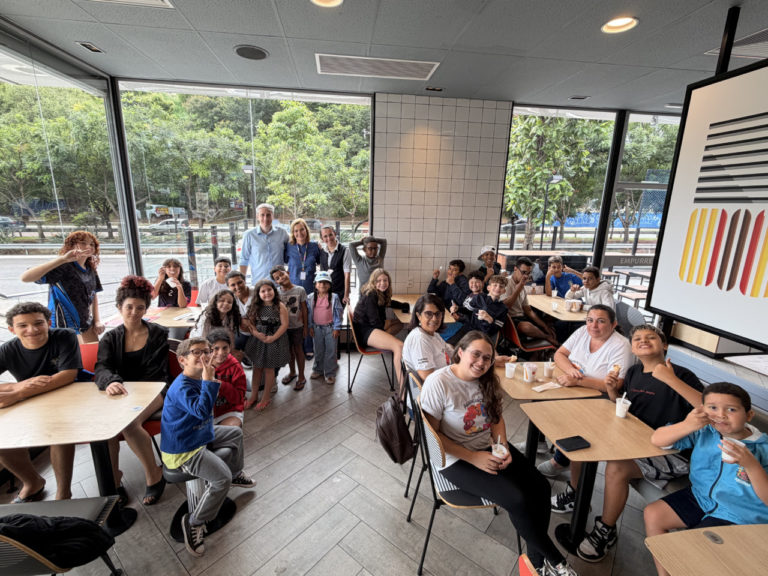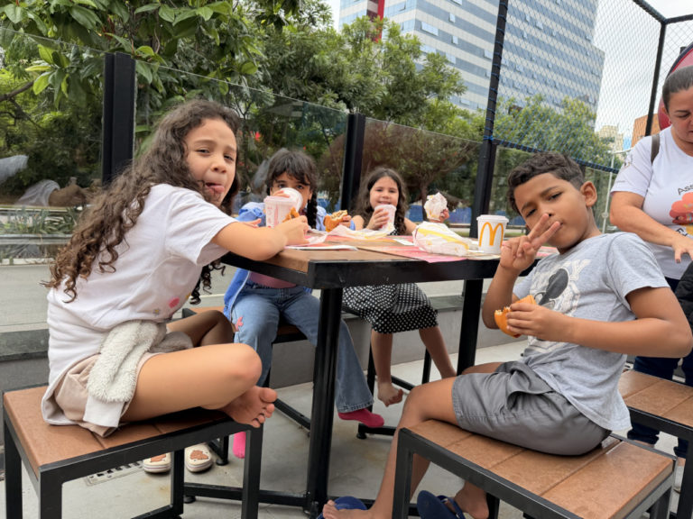 Para encerrar a manhã, o grupo visitou o McDonald’s, onde recebeu um kit especial com lanche, suco, batata frita, sobremesa e brinquedo.