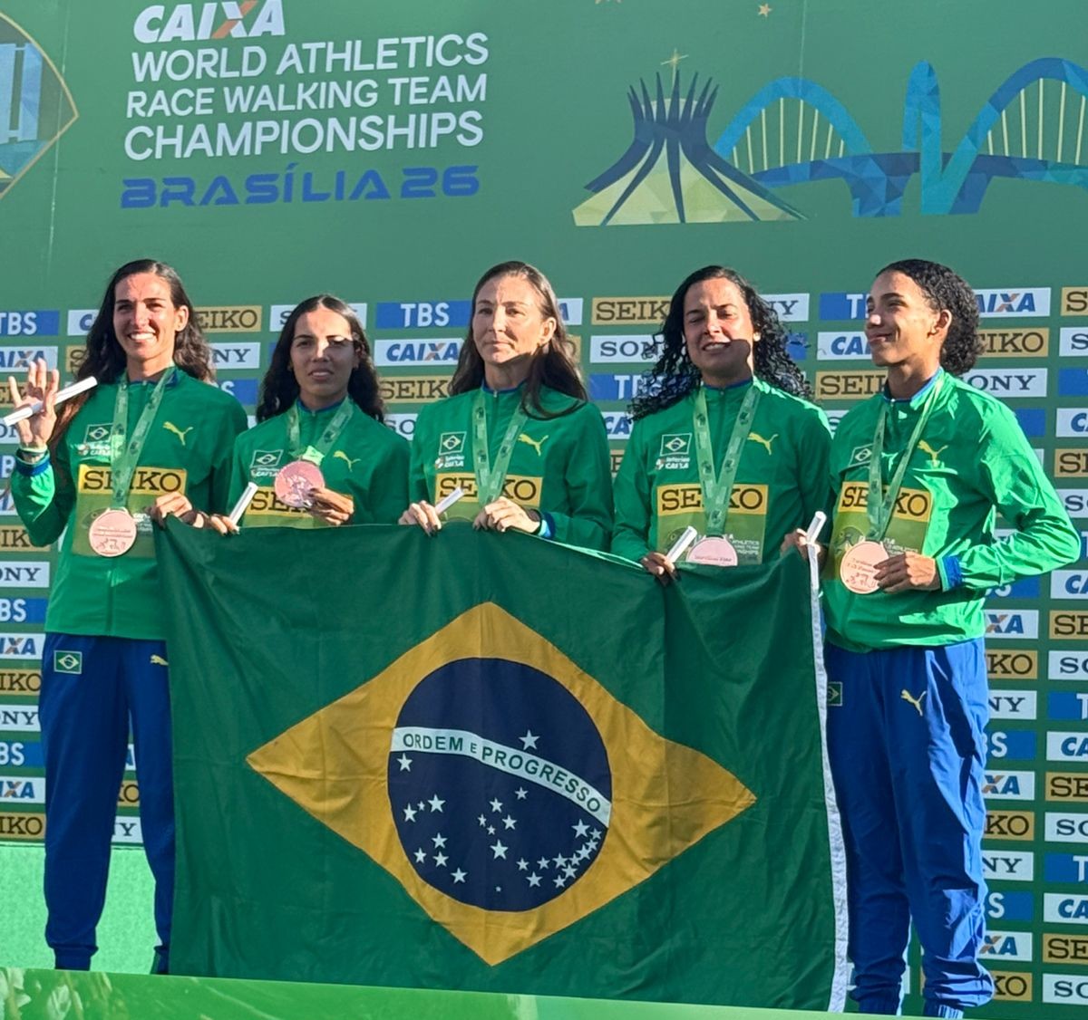 Publicada em 13/04/2026 às 16:00A atleta Thaissa Gabrielle Santos Cunha, do Time Jundiaí de Atletismo, integrou a equipe do Brasil que faturou, neste domingo (12), a medalha de bronze na Maratona por Equipes do Campeonato Mundial de Marcha Atlética, disputada em Brasília.