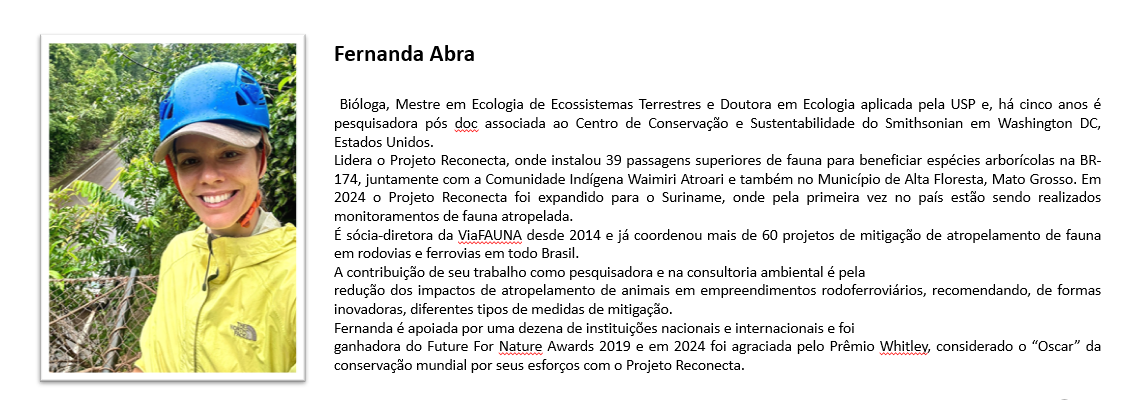 11h30 – 12h00 “As experiências nacionais e internacionais nos estudos para instalação, monitoramento e manutenção de passagens de fauna para a redução de atropelamentos de fauna em empreendimentos rodoferroviários.”