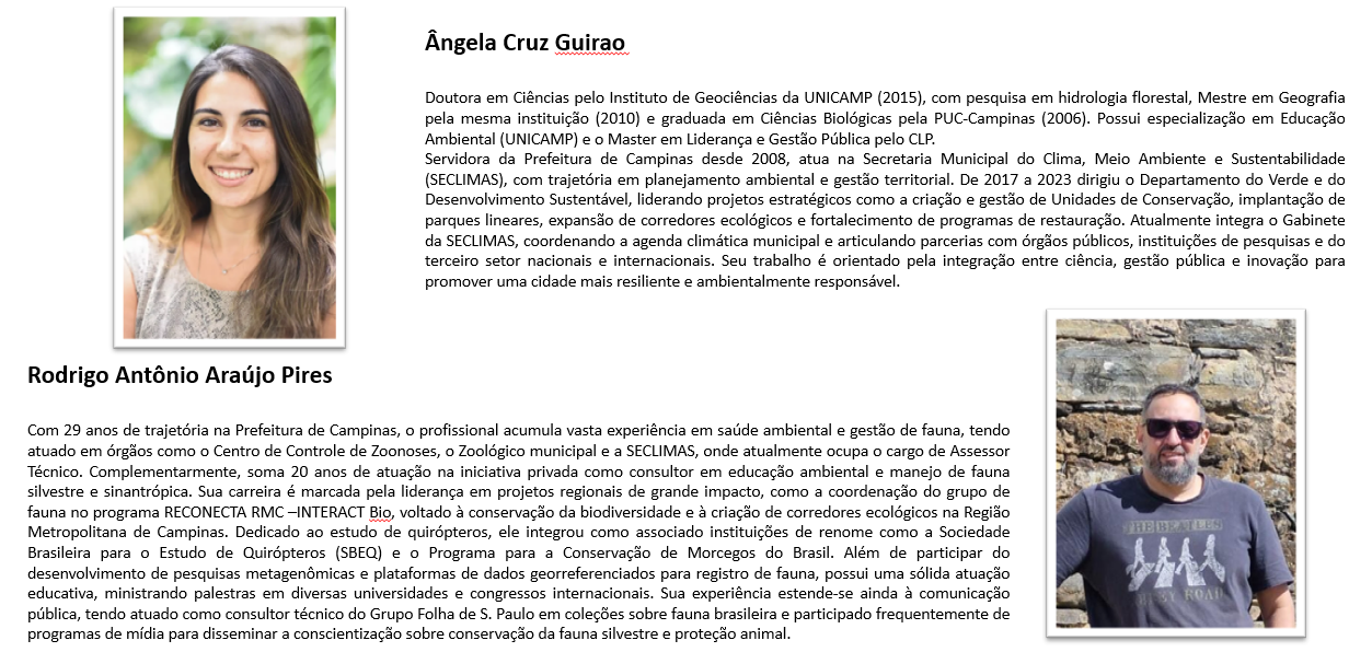 9h00 – 9h30 “Prefeitura de Campinas – A experiência do município de Campinas na instalação e manutenção de passagens de fauna e no monitoramento de sua efetividade”.