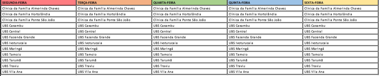A Secretaria Municipal de Promoção da Saúde (SMPS) informa que a vacinação contra a COVID-19 ocorre conforme disponibilidade de doses nas unidades de saúde. Os locais são atualizados periodicamente de acordo com o estoque disponível no município.